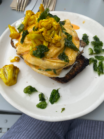 My morning this Saturday was spent working on the blog post that went live just before this one. By the time I got to a good stopping place, it was just about time to leave for brunch with Fiona, the woman who is hosting me here in Auckland. We had been looking forward to trying out this restaurant called Honey Bones all week! And, boy oh boy, did it deliver! It is very popular, with a number of people waiting for tables, but we were able to get seated right away. I enjoyed a coconut milk latte with the Istanbul Scrambled, which was GF Freedom Bread (made by a bakery in Auckland) topped with whipped feta cheese, parsley, curried cauliflower, crisp sage, za’atar, and, of course, scrambled eggs.