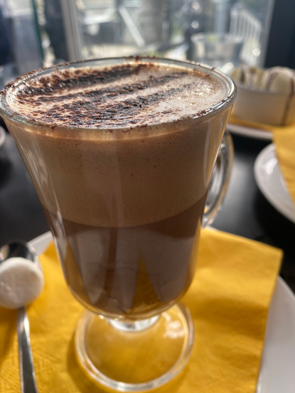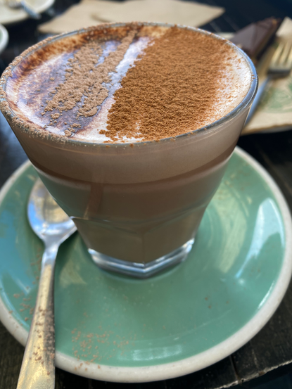 It was just about the right time for afternoon tea, so we stopped at a little cafe with some spectacular wrap-around views. We split a fudgy brownie and caramel slice and each enjoyed a hot drink. I felt like the treats weren’t enough chocolate, so I opted for a hot spiced chocolate chai as my choice.
